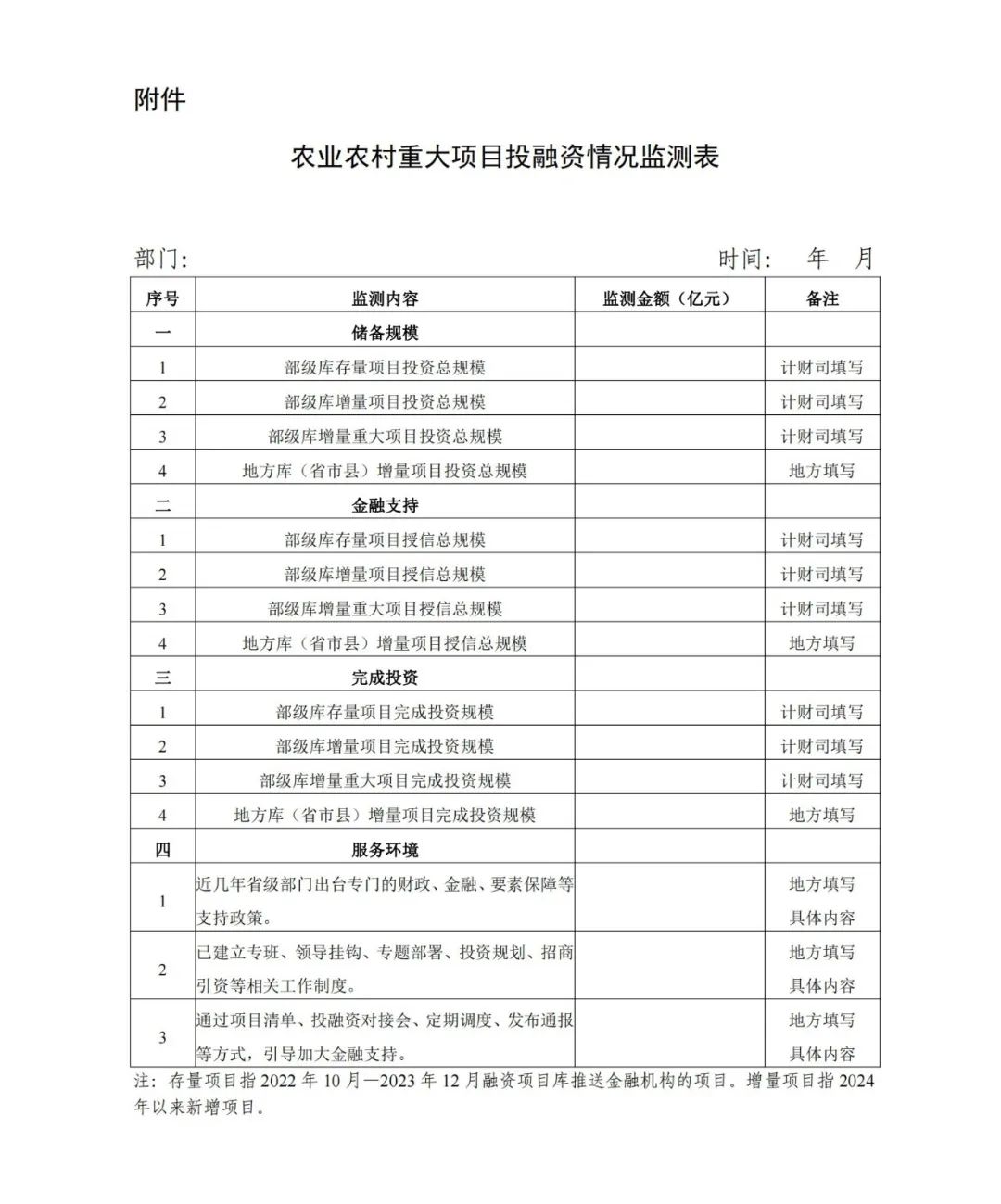 (二)加強(qiáng)項(xiàng)目監(jiān)測管理。要定期發(fā)布報(bào)告,對區(qū)域內(nèi)重大項(xiàng)目投融資建設(shè)進(jìn)度、實(shí)施成效等進(jìn)行調(diào)度、監(jiān)測。我部將會(huì)同中國人民銀行,按季對各省實(shí)施情況進(jìn)行監(jiān)測。各省級農(nóng)業(yè)農(nóng)村部門運(yùn)用地方性平臺(tái)開展項(xiàng)目儲(chǔ)備且數(shù)據(jù)未上傳綜合融資服務(wù)平臺(tái)的,應(yīng)于每季度初5日前報(bào)送上季度地方自有平臺(tái)投融資項(xiàng)目儲(chǔ)備情況和投融資情況監(jiān)測表(附件)。