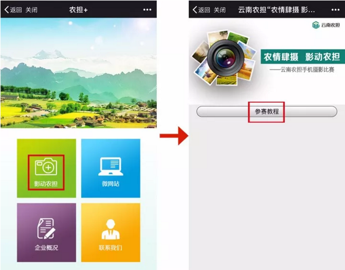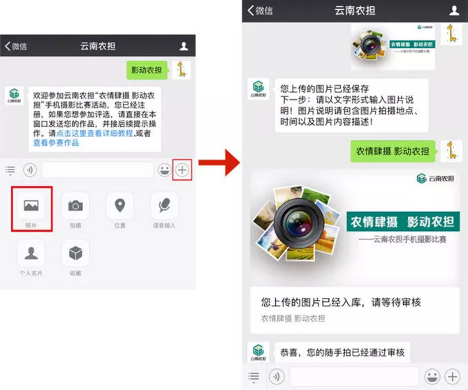 參與方式二:關注“云南農擔”官方微信號,點擊“農擔+”欄目,選擇“影動農擔”進入,查看教程后,完成信息錄入,在對話框內發(fā)送1張圖片及一句話描述即可。