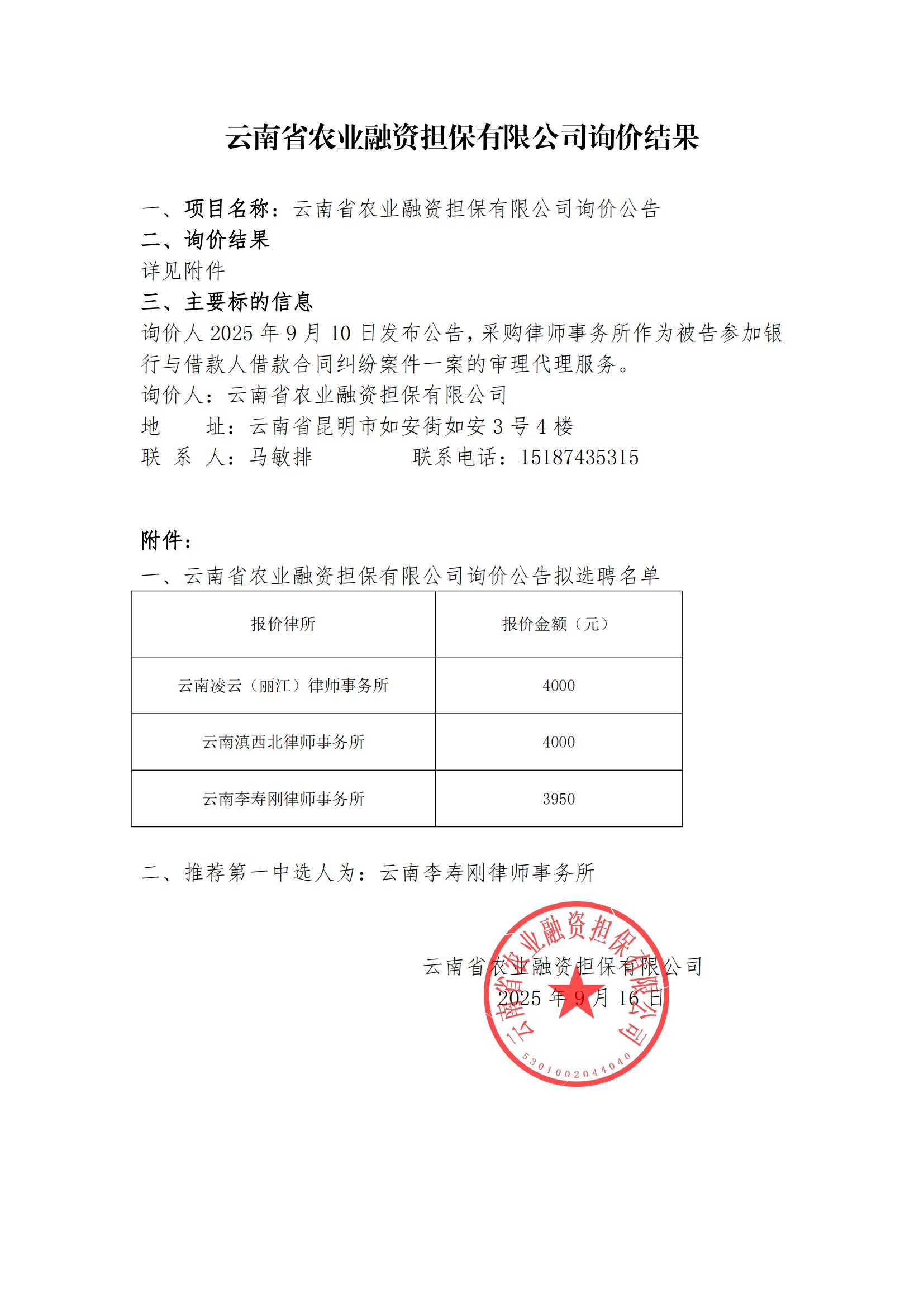 云南省農(nóng)業(yè)融資擔(dān)保有限公司詢價(jià)結(jié)果