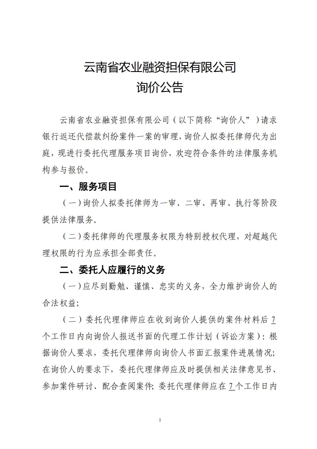 云南省農(nóng)業(yè)融資擔(dān)保有限公司詢價(jià)公告