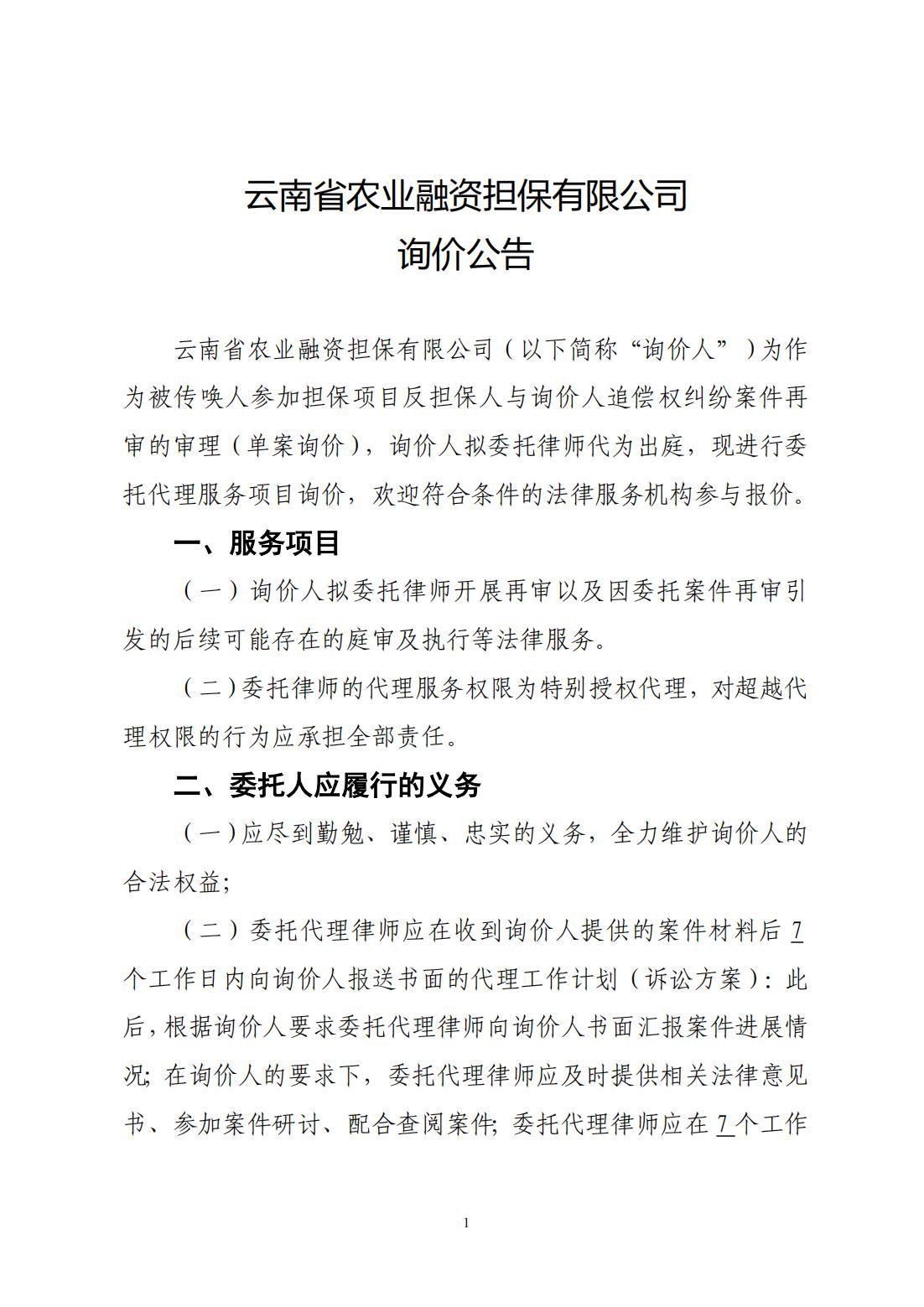 云南省農(nóng)業(yè)融資擔(dān)保有限公司詢價(jià)公告