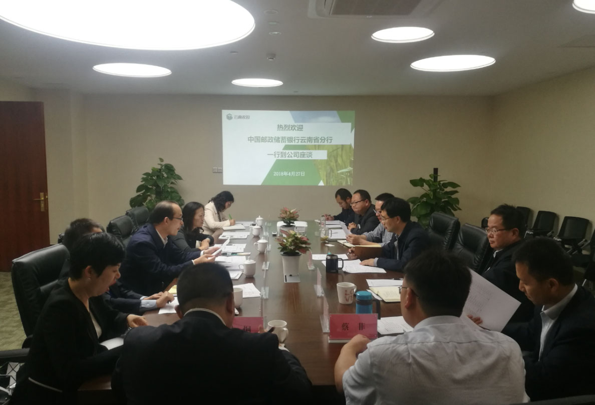2018年4月27日,中國郵政儲蓄銀行云南省分行孟浩副行長一行到省農(nóng)擔(dān)公司座談,公司郭影董事長、杜開波總經(jīng)理、廖寅皓副總經(jīng)理及各部門負(fù)責(zé)人出席會議,雙方就下一步展開深度合作展開座談。