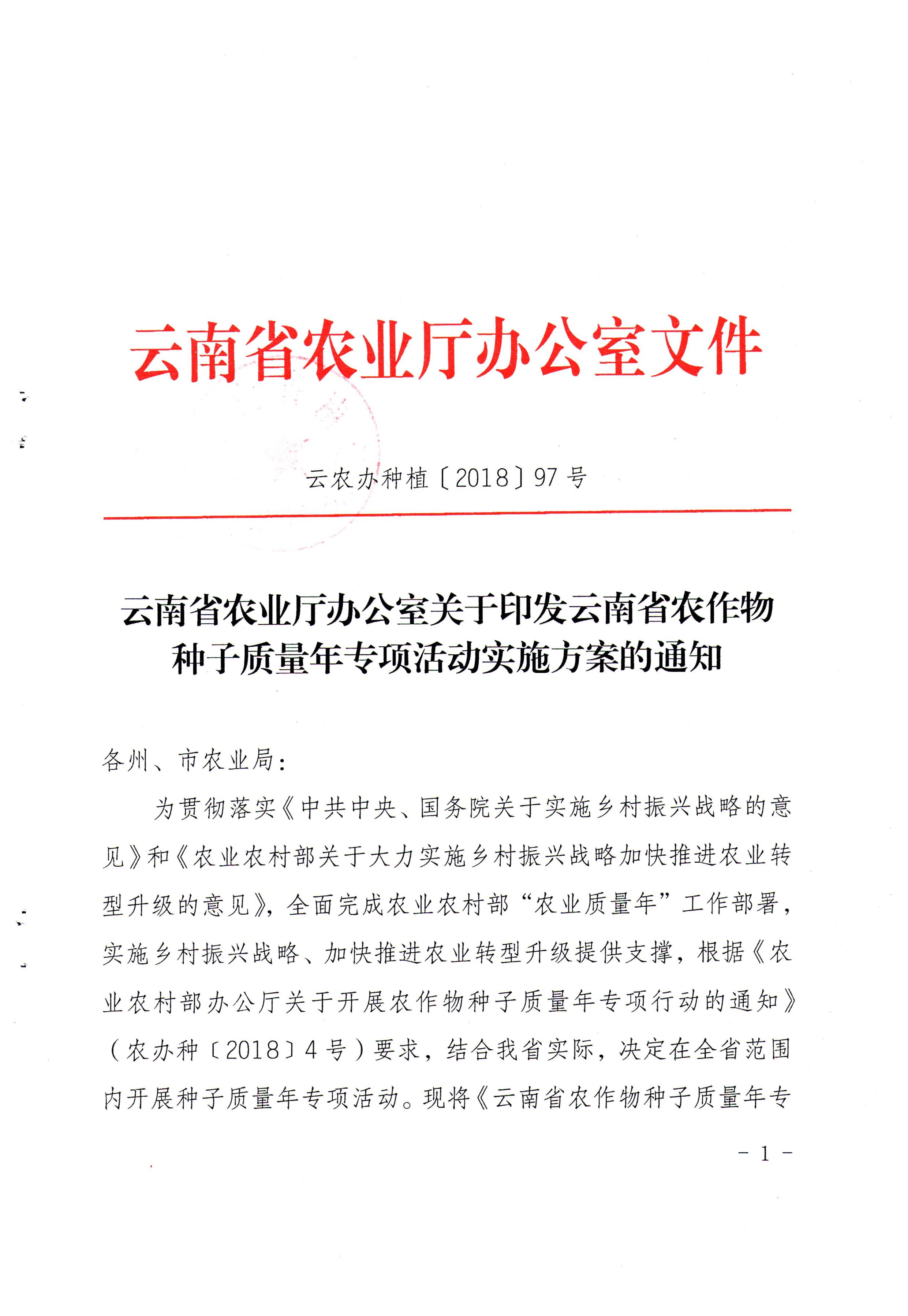 云南省農(nóng)業(yè)廳辦公室關(guān)于印發(fā)云南省農(nóng)作物種子質(zhì)量年專項(xiàng)活動(dòng)實(shí)施方案的通知