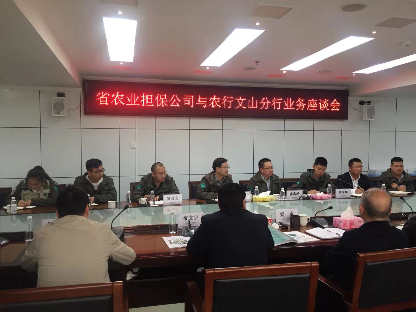 2018年11月27日,省農(nóng)擔公司董事長郭影、副總經(jīng)理廖寅皓、農(nóng)擔二部副總經(jīng)理賈萬文以及辦事處負責人李少峰帶領(lǐng)文山、硯山辦事處人員前往農(nóng)業(yè)銀行文山州分行參加座談。出席座談的有農(nóng)行州分行梁永行長、布文宇副行長以及各分管部門領(lǐng)導。