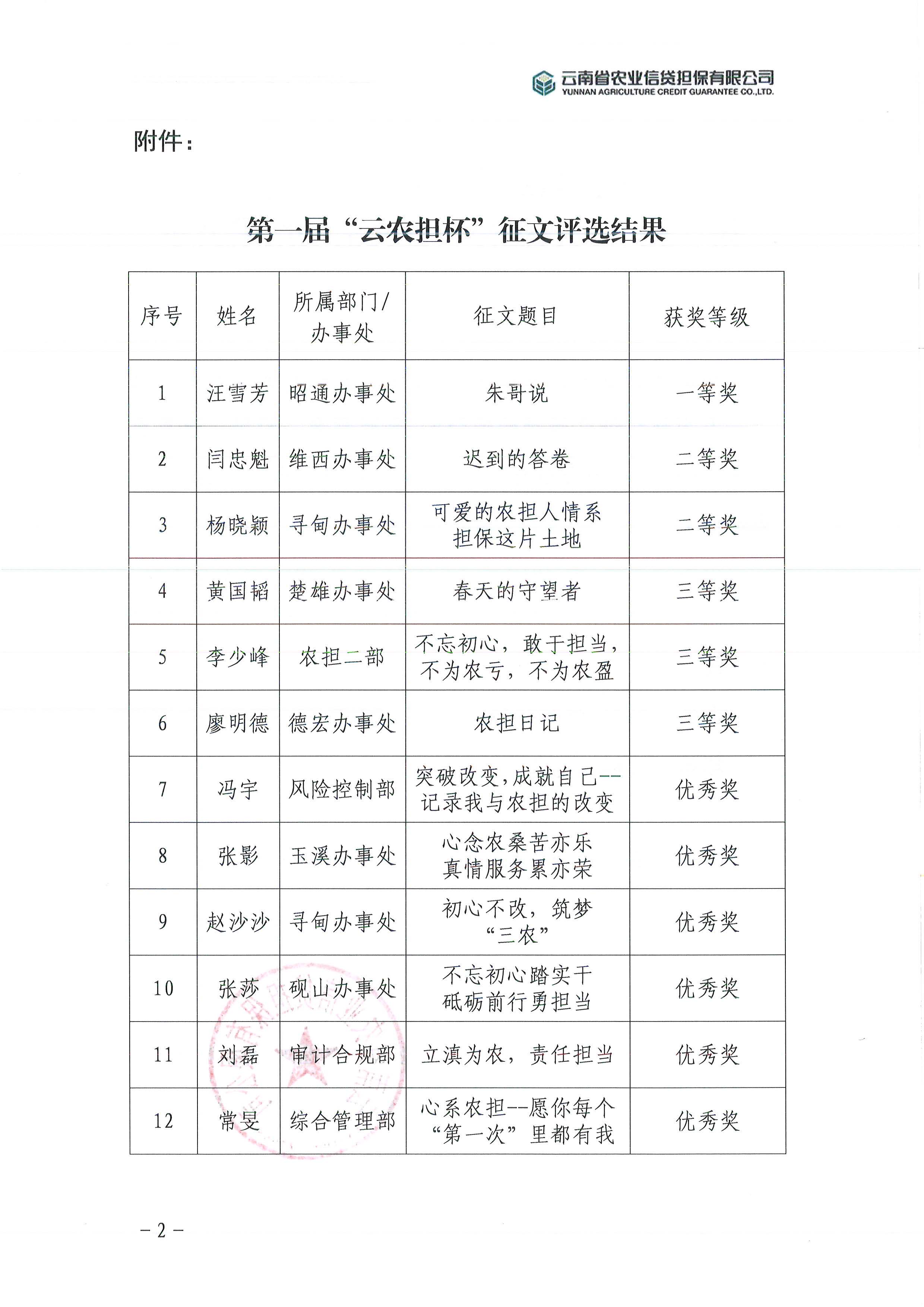 云南省農(nóng)業(yè)信貸擔(dān)保公司第一屆“云農(nóng)擔(dān)杯”征文活動(dòng)結(jié)果公示各部門(mén)、辦事處: