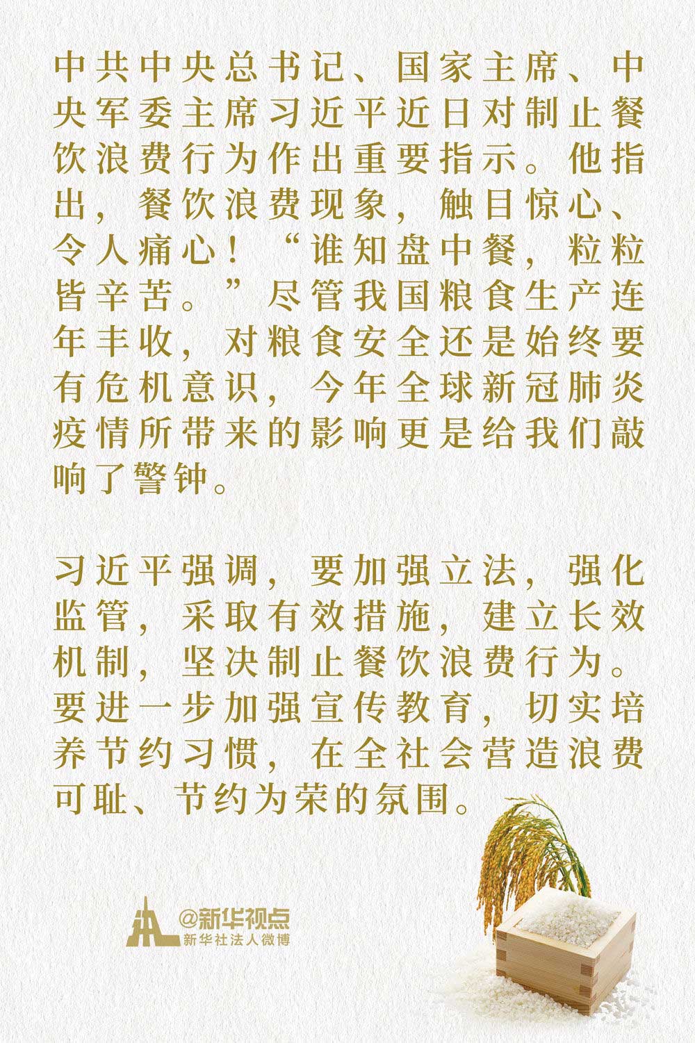 新華社播發(fā)的消息中,回顧了黨的十八大以來,習(xí)近平總書記對(duì)糧食安全問題和提倡“厲行節(jié)約、反對(duì)浪費(fèi)”社會(huì)風(fēng)尚作出的多次指示,特別提到了2013年1月在一份材料上的批示。