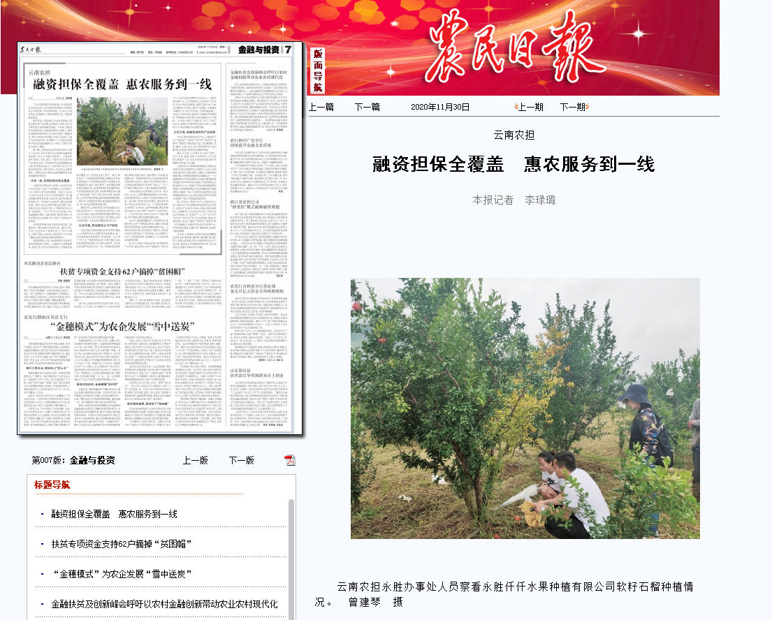 10月,國(guó)家農(nóng)擔(dān)公司微信公眾號(hào)“農(nóng)擔(dān)經(jīng)驗(yàn)談”專欄中對(duì)云南農(nóng)擔(dān)公司認(rèn)真貫徹落實(shí)云南省脫貧攻堅(jiān)等扶貧政策,支持麗江永勝縣農(nóng)業(yè)生產(chǎn)、帶動(dòng)貧困戶脫貧增收,積極為當(dāng)?shù)匦滦娃r(nóng)業(yè)經(jīng)營(yíng)主體提供融資擔(dān)保服務(wù)進(jìn)行了宣傳?!掇r(nóng)民日?qǐng)?bào)》從國(guó)家農(nóng)擔(dān)公司了解到云南農(nóng)擔(dān)支農(nóng)惠農(nóng)的相關(guān)情況后,11月30日以《融資擔(dān)保全覆蓋 惠農(nóng)服務(wù)到一線》為題報(bào)道了云南農(nóng)擔(dān)公司成立以來(lái),不斷完善分支機(jī)構(gòu)布局,實(shí)現(xiàn)了機(jī)構(gòu)、業(yè)務(wù)和人員的全面下沉,形成了覆蓋全省的農(nóng)擔(dān)基層服務(wù)網(wǎng)絡(luò)體系,以點(diǎn)帶面、立足當(dāng)?shù)?,為推?dòng)縣域經(jīng)濟(jì)和云南高原特色農(nóng)業(yè)產(chǎn)業(yè)發(fā)展、推進(jìn)農(nóng)業(yè)供給側(cè)結(jié)構(gòu)性改革、助力脫貧攻堅(jiān)、助推“鄉(xiāng)村振興”戰(zhàn)略實(shí)施發(fā)揮了積極作用。
