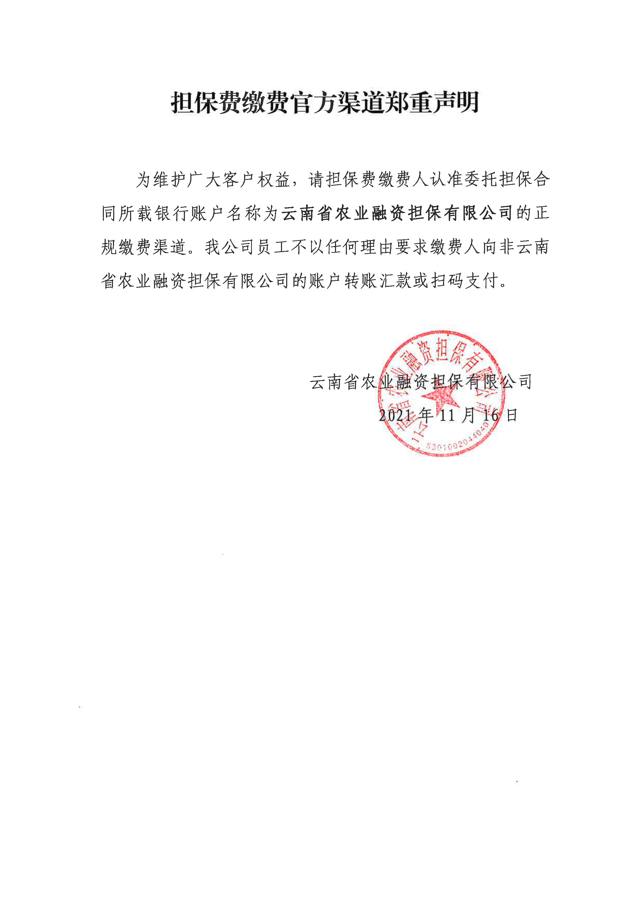 云南省農(nóng)擔(dān)公司擔(dān)保費(fèi)繳費(fèi)官方渠道鄭重聲明
