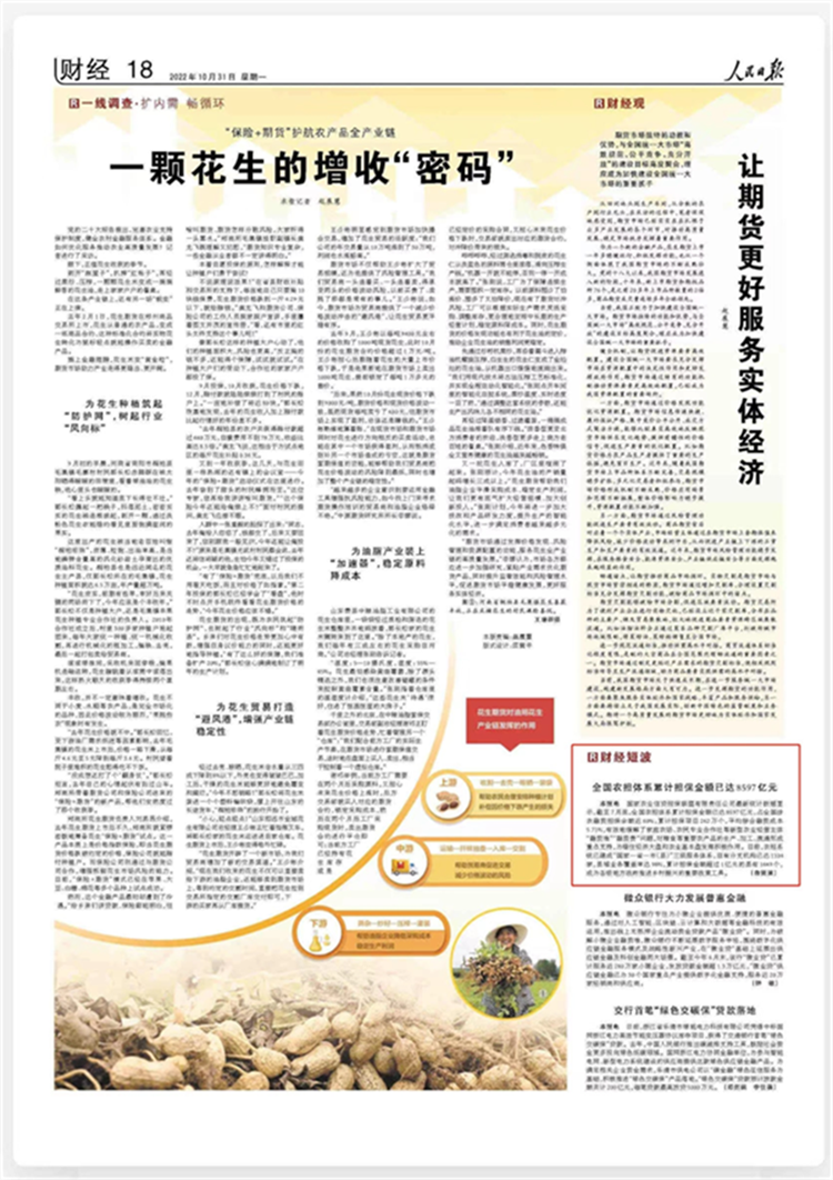 《人民日?qǐng)?bào)》于2022年10月31日【財(cái)經(jīng)18版】刊發(fā)“財(cái)經(jīng)短波--全國(guó)農(nóng)擔(dān)體系累計(jì)擔(dān)保金額已達(dá)8597億元”。報(bào)道肯定了全國(guó)農(nóng)擔(dān)體系近年來(lái)的工作成效,并指出:全國(guó)農(nóng)擔(dān)體系為穩(wěn)住經(jīng)濟(jì)大盤和農(nóng)業(yè)基本盤發(fā)揮積極作用,成為各級(jí)地方政府推進(jìn)鄉(xiāng)村振興的重要政策工具。
